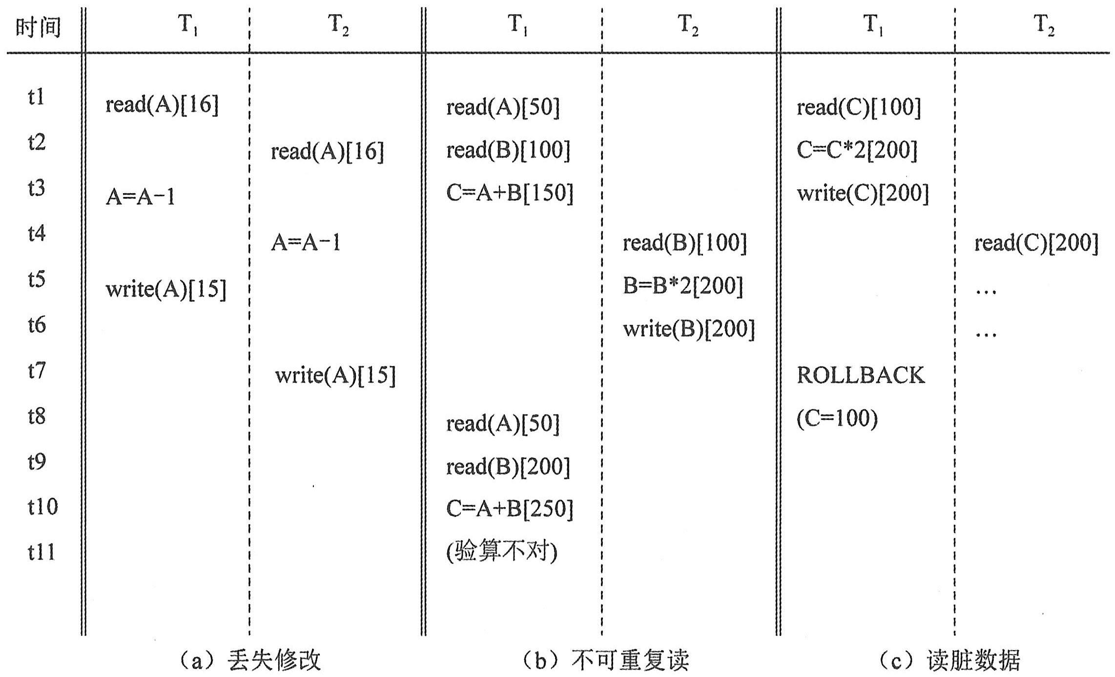 (3)读脏数据:事务T1修改某一数据,事务T2读取同一数据,而T1由于某种原因被撤销,则T2读到的数据就为“脏”数据,即不正确的数据。例如,T1C由100改为200,T2读到C为200,而事务T1由于被撤销,其修改宣布无效,C恢复为原值100,而T2却读到了C为200,与数据库内容不一致。