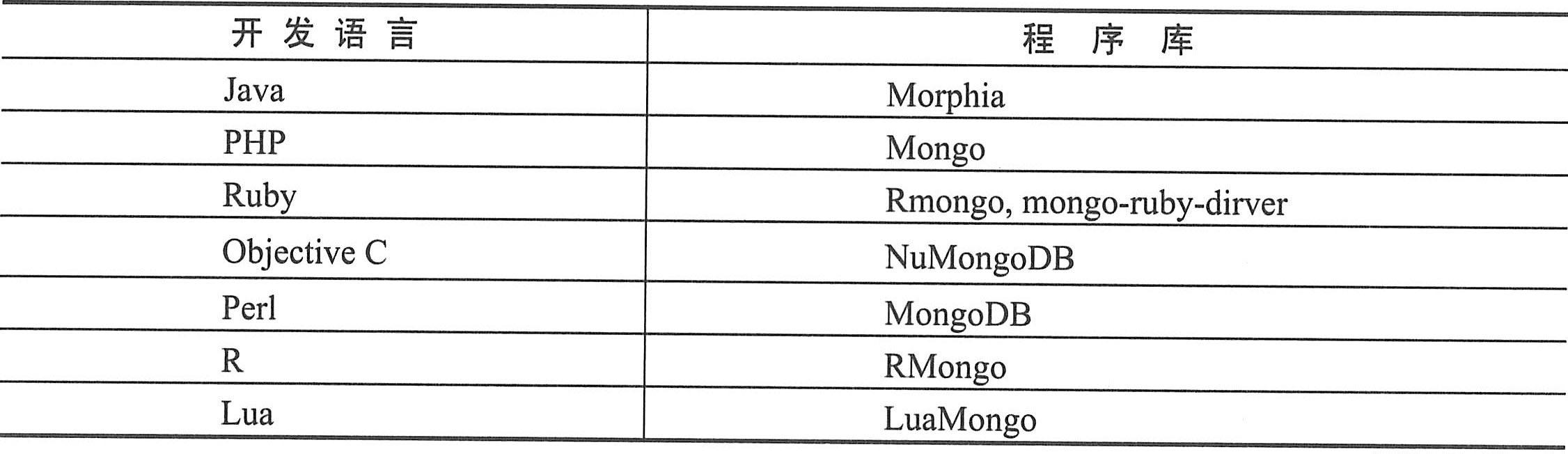 MangoDB为C、C#、.NET、Java、PHP等各种开发语言提供了程序库,如下表所示。