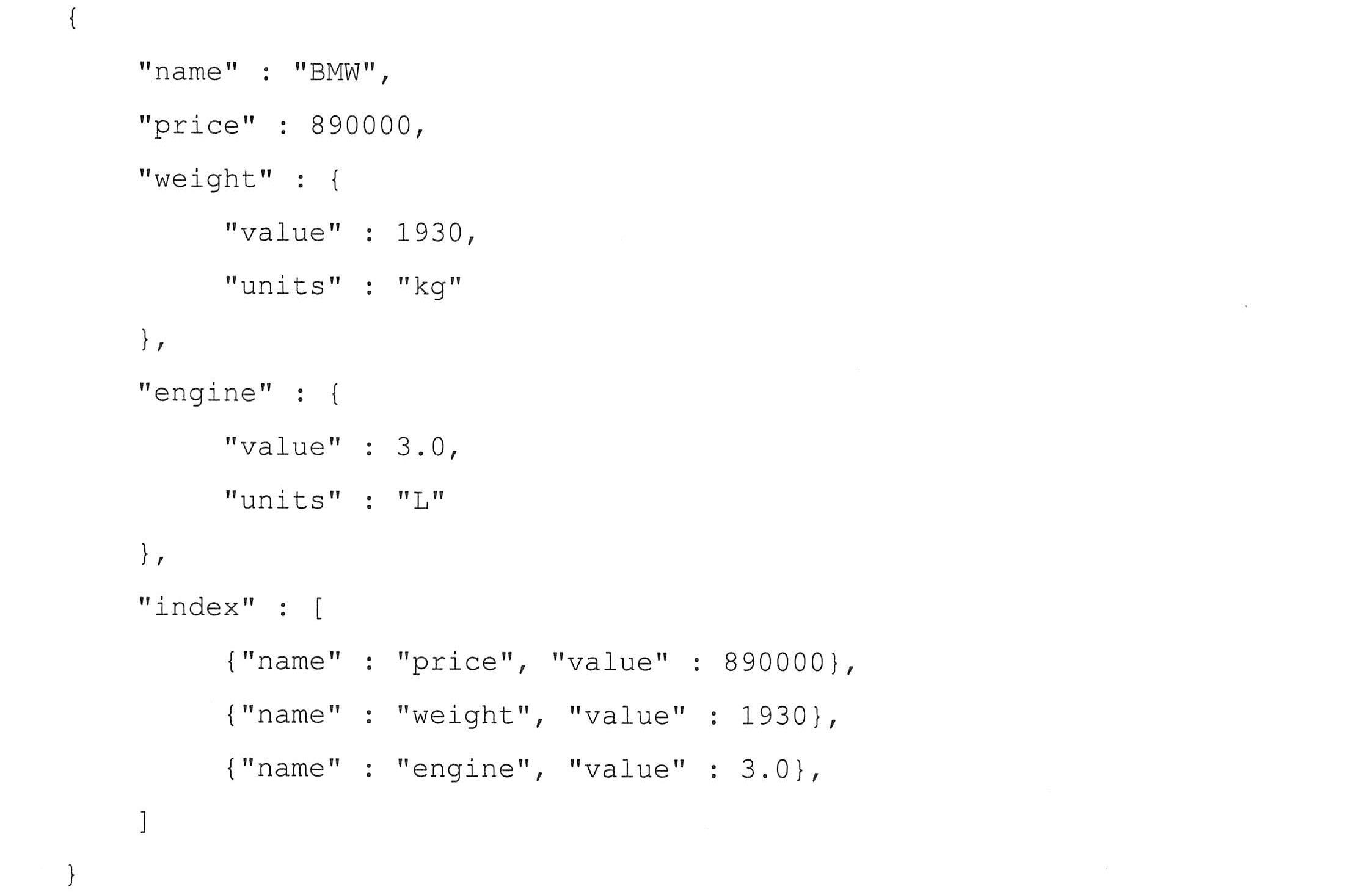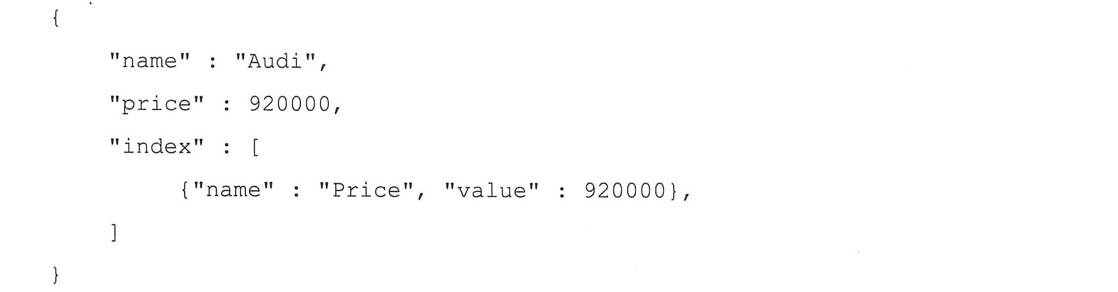 MangoDB能存放任意数量、任意属性的被统计信息,这样应用就能轻易扩展,但目前还不能对当前的格式进行有效的索引。MangoDB索引可以将数组的每一个元素进行涵盖,所以可以将想要索引的属性放到一个保护常用键名的数组中。例如,对于宝马汽车,可以为索引添加一个数组,将全部属性放到数组中: