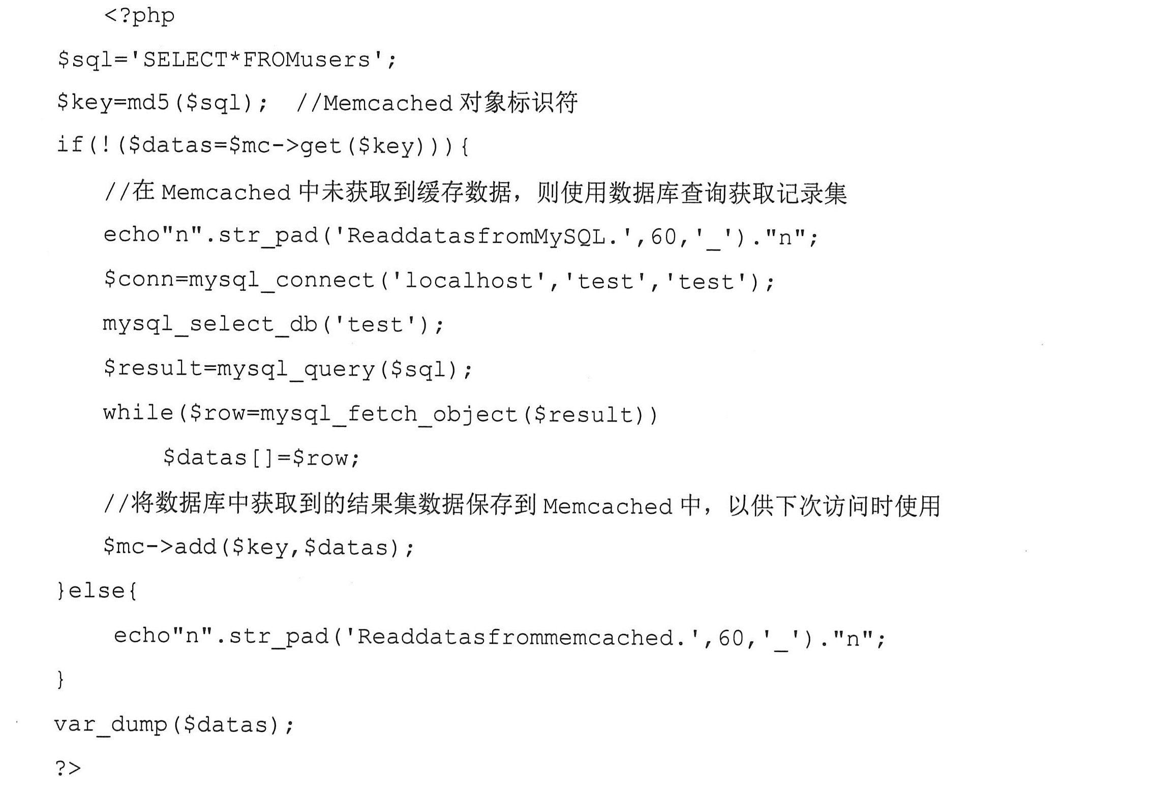 在实际应用中,通常会把数据库查询的结果集保存到Memcached中,下次访问时直接从Memcached中获取,而不再做数据库查询操作,这样可以在很大程度上减轻数据库的负担。通常会将SQL语句md5()之后的值作为唯一标识符key。下边是一个利用Memcached来缓存数据库查询结果集的示例(此代码片段紧接上边的示例代码):