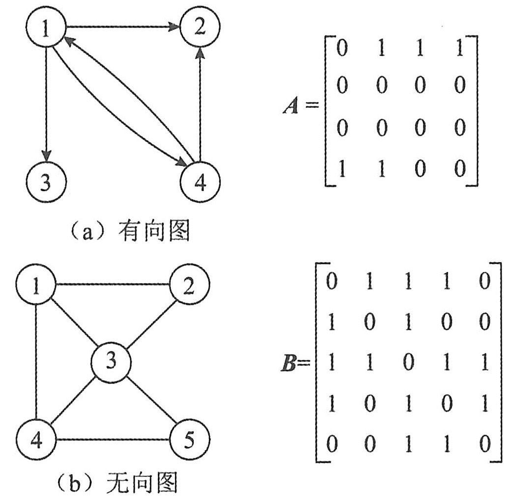有向图和无向图的邻接矩阵如下图中的矩阵A和B所示。