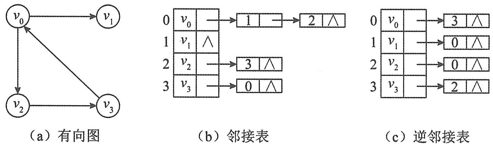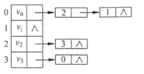 下图(b)是下图(a)所示有向图的邻接表。从中可以看出,由于第i个邻接链表中表结点的数目只是顶点νi的出度,因此必须逐个扫描每个顶点的邻接表,才能求出一个顶点的入度。为此,可以建立一个有向图的逆邻接链表,如下图(c)所示。