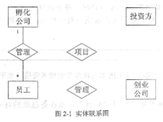 (4)投资方和创业公司之间依靠孵化公司牵线建立创业项目合作关系,具体实施由孵化公司的一位员工负责协调投资方和创业公司的一个创业项目。一个创业项目只属于一个创业公司,但可以接受若干投资方的投资。创业项目信息包括项目编号、创业公司代码、 投资方编号和孵化公司员工工号。