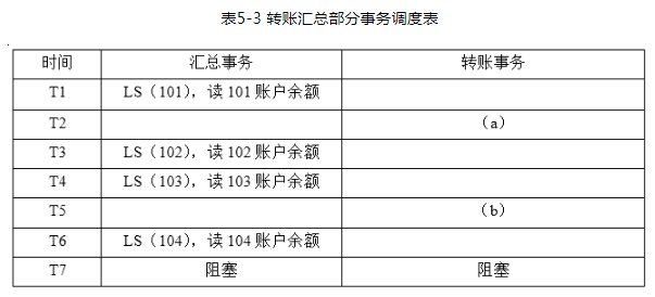 在【问题2】的基础上,引入共享锁指令LS0和解锁指令US()。对【问题2】中的调度进行重写,要求满足两段锁协议。两个事务执行的某种调度顺序如表5-3所示,.该调度顺序使得汇总事务和转账事务形成死锁。请补全表中的空缺处(a)、(b)。