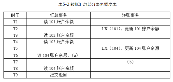 引入排它锁指令LX()和解锁指令UX(),要求满足两段锁协议和提交读隔离级别。假设在进行余额汇总交易的同时,发生了一笔转账交易。从101账户转给104账户400元。 这两笔事务的调度如表5-2所示。