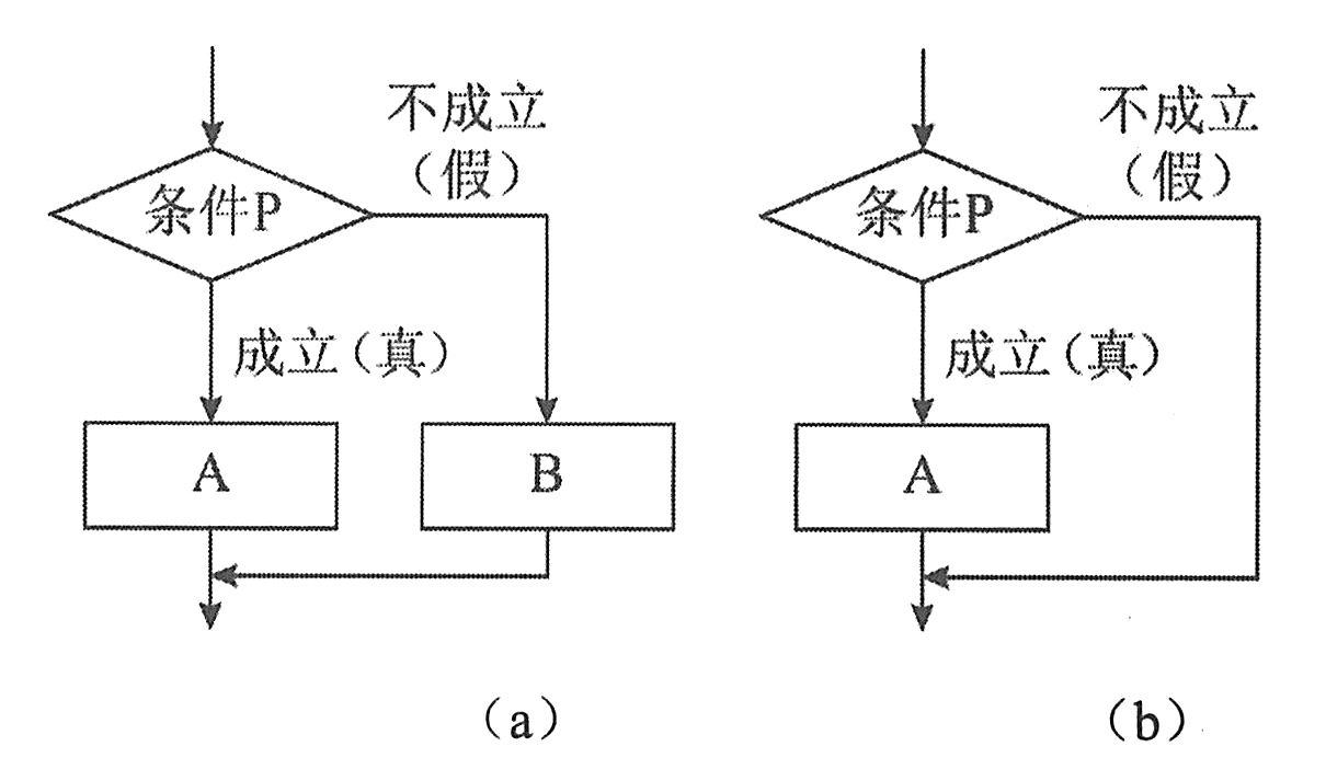 选择结构提供了在两种或多种分支中选择其中一个的逻辑。基本的选择结构是指定一个条件P,然后根据条件的成立与否决定控制流走计算A还是计算B,从两个分支中选择一个执行,如下图(a)所示。选择结构中的计算A或计算B还可以包含顺序、选择和重复结构。程序语言中通常还提供简化了的选择结构,也就是没有计算B的分支结构,如下图(b)所示。