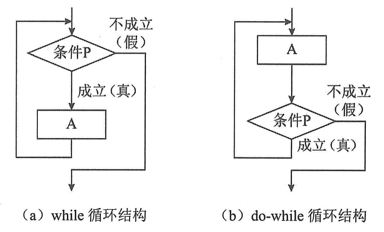 循环结构描述了重复计算的过程,通常由三部分组成:初始化、循环体和循环条件。其中初始化部分有时在控制的逻辑结构中不进行显式的表示。循环结构主要有两种形式:while型循环结构和do-while型循环结构。while型结构的逻辑含义是先判断条件P,若成立则执行循环体A,然后再去判断条件P;否则控制流就退出循环结构,如下图(a)所示。do-while型结构的逻辑含义是先执行循环体A,然后再判断条件P,若成立则继续执行A的过程并判断条件;否则控制流就退出循环结构,如下图(b)所示。
