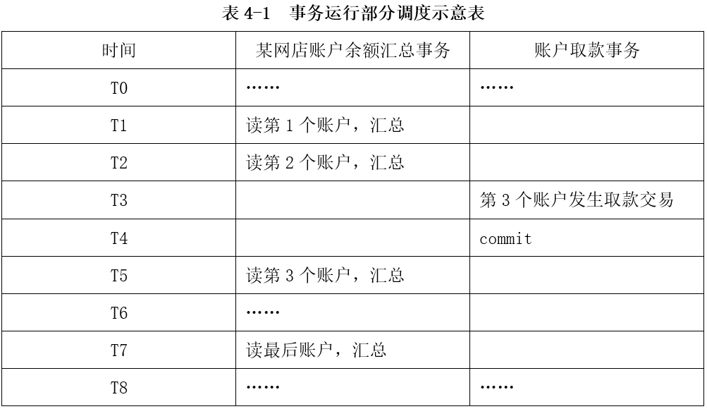 假设日终某网点当日余额汇总操作和同一网点某账户取款交易同一时间发生,对应事务的部分调度序列如表4-1所示。