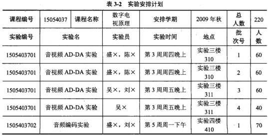 2.以课程为单位制定实验安排计划信息,•包括:实验地点,实验时间、实验员等信息。实验计划如表3-2所示。