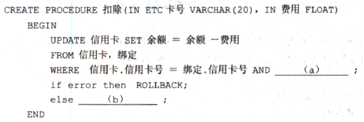 (共15分) 阅读下列说明,回答问题1至问题3,将解答填入答题纸的对应栏内。 【说明】 某高速路不停车收费系统(ETC)的业务描述如下: (1)车辆驶入高速路入口站点时,将驶入信息(ETC卡号,入口编号,驶入时间) 写入登记表; (2)车辆驶出高速路出口站点(收费口)时,将驶出信息(ETC卡号,出口编号, 驶出时间)写入登记表;根据入口编号、出口编号及相关收费标准,清算应缴费用,并从绑定的信用卡中扣除费用。 一张ETC卡号只能绑定一张信用卡号,针对企业用户,一张信用卡号可以绑定多 个ETC卡号。使用表绑定(ETC卡号,信用卡号)来描述绑定关系,从信用卡(信用卡号,余额)表中扣除费用。 针对上述业务描述,完成下列问题: