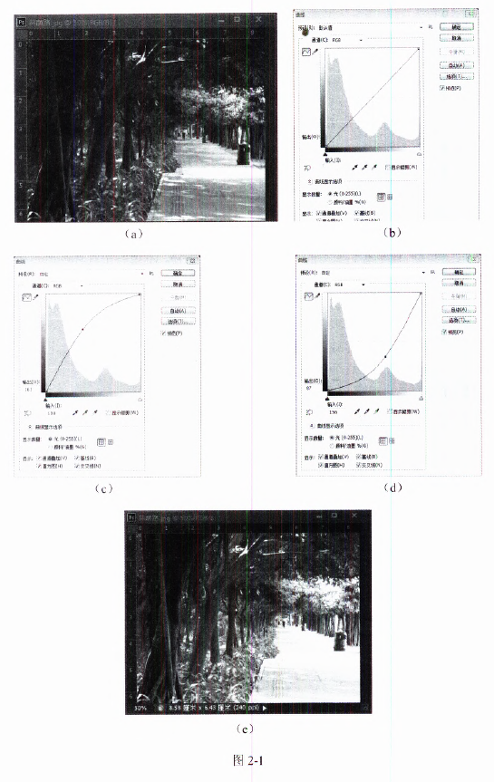 在Photoshop中打开一幅如图2-1 (a)所示的林荫路图像,然后执行“图像→调整→曲线”菜单项,显示如图2-1 (b)所示的曲线窗口。将该面板曲线调整为2-1 (c). 2-1 (d) 中的哪一种能够使图2-1 (a) 变为图2-1 (e) ?