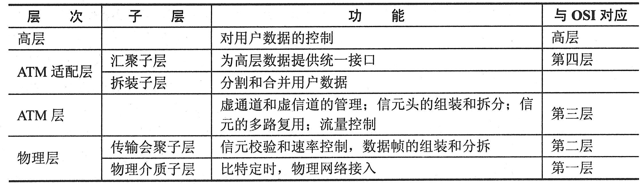 在ATM中,信元不仅是传输的基本单位,也是交换的信息单位,它是虚电路式分组交换的一个特例。与分组相比,由于信元是固定长度的,因此可以高速地进入处理和交换。ATM的典型数据速率为150Mbps,ATM是面向连接的,所以在高速交换时要尽量减少信元的丢失。ATM建立了四层体系结构,下表总结了它们的功能以及与OSI层次的对应关系。