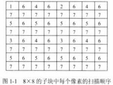 如果PNG文件的InterlaceMethod字段等于1,则图像数据块采用Adam 7遍隔行扫描方法存储各个像素的颜色值。具体方法是将原图像分割成多个8×8的子块,毎个子块中不同位置的像素被赋予不同的顺序值(如图1-1所示)。在第1遍扫描中,以行为单位依次存储各个子块中标号为1的像素;在第2遍扫描中,以行为单位依次存储各子块中标号为2的像素;以此类推,直至第7遍扫描。