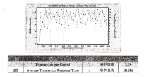 下图为并发50个用户执行“稿件查询”操作的测试结果。 (1)请判断结果是否满足系统性能需求并说明理由。 (2)简要说明 Transactions per Second 与 Average Transaction Response Time 之间的关系。
