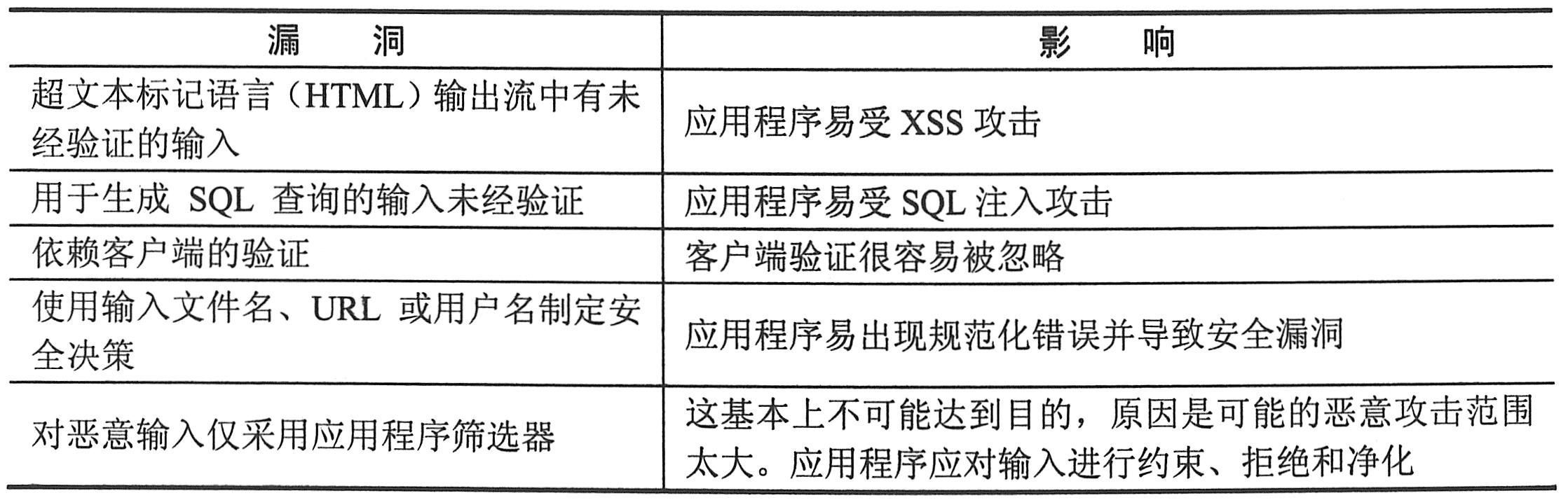 需要对应用程序验证输入内容的方式进行检验,因为很多Web应用程序攻击都故意使用格式错误的输入。SQL注入、跨站点脚本(XSS)、缓冲区溢出、代码注入以及无数其他拒绝服务和特权提升攻击都可利用输入验证中的漏洞。下表中重点列出了常见的输入验证漏洞。