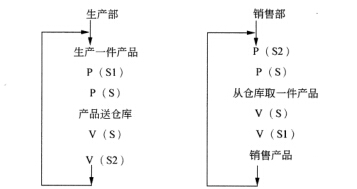 某企业有生产部和销售部,生产部负责生产产品并送入仓库,销售部从仓库取出产品销售。假设仓库可存放n件产品。用PV操作实现他们之间的同步过程如下图所示。