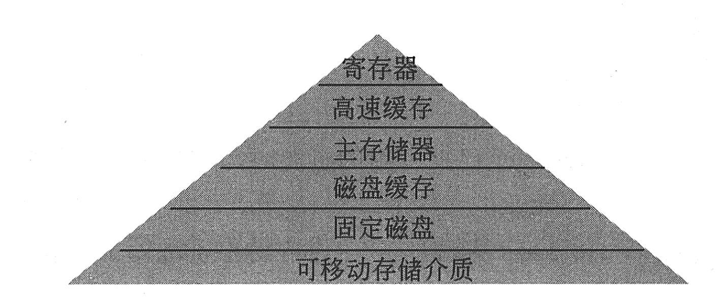 目前,计算机系统均采用分层结构的存储子系统,以便在容量大小、速度快慢、价格高低诸因素中取得平衡点,获得较好的性能价格比。计算机系统的存储器可以分为寄存器、高速缓存、主存储器、磁盘缓存、固定磁盘、可移动存储介质等7个层次结构。如下图所示,越往上,存储介质的访问速度越快,价格也越高。其中,寄存器、高速缓存、主存储器和磁盘缓存均属于操作系统存储管理的管辖范畴,掉电后它们存储的信息不再存在。固定磁盘和可移动存储介质属于设备管理的管辖范畴,它们存储的信息将被长期保存。而磁盘缓存本身并不是一种实际存在的存储介质,它依托于固定磁盘,提供对主存储器存储空间的扩充。
