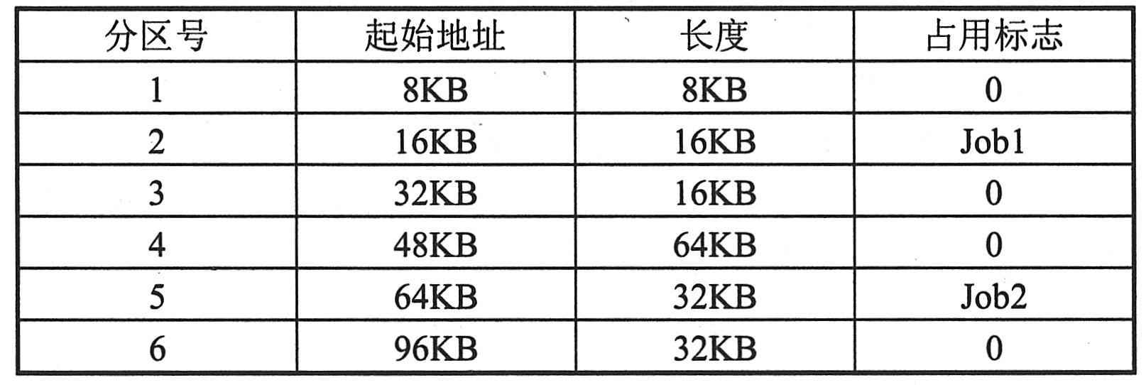 主存分配表指出各分区的起始地址和长度,表中的占用标志位用来指示该分区是否被占用了,当占用的标志位为“0”时,表示该分区尚未被占用。进行主存分配时总是选择那些标志为“0”的分区,当某一分区分配给一个作业后,则在占用标志栏填上占用该分区的作业名,如下图所示,第2、5分区分别被作业Jobl和Job2占用,而其余分区为空闲。