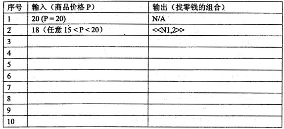 请采用等价类划分法为该软件设计测试用例(不考虑P为非整数的情况)并填入到下表中。(<<N1,2>>表示2张1元,若无输出或输出非法,则填入N/A)