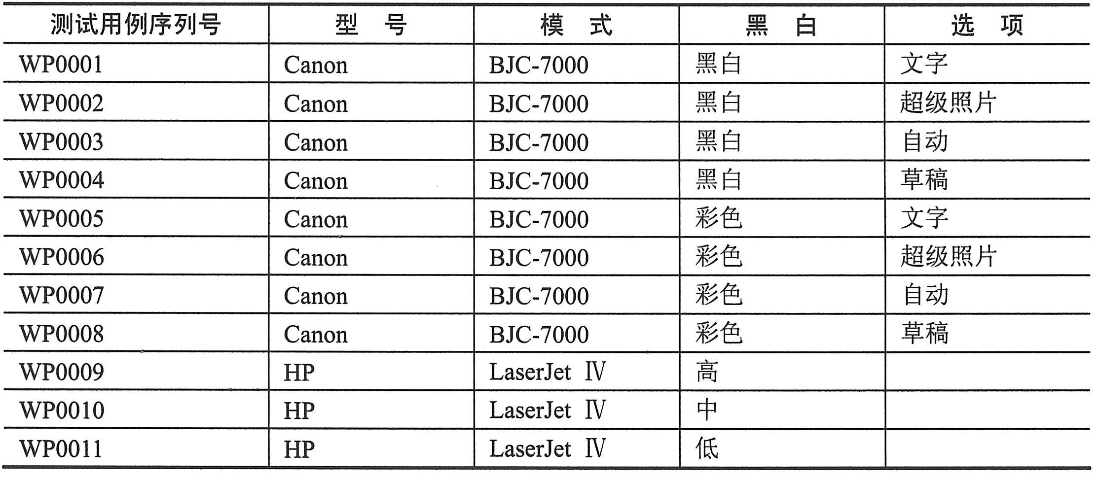 采用简便方法并不是说放弃或者忽视重要的信息,而是意在找出一个更有效的方法对这些信息进行精简,例如,没有必要刻意要求不能用书面段落形式表述测试用例。如下表给出了一个打印机兼容性简单列表的例子。