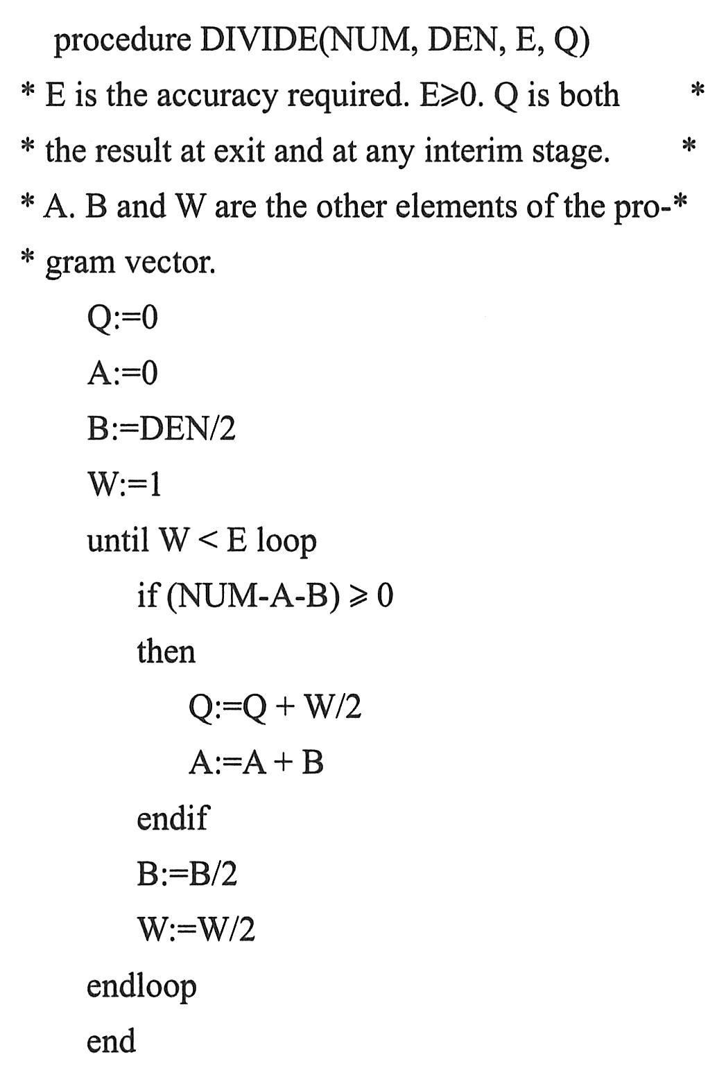 假定两个非负数中,NUM小于M(即所得之商小于1),算法中只用到加、减及除2的运算。该迭代算法的程序如下图所示。