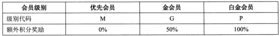 (共20分) 阅读下列说明,回答问题1和问题2,将解答填入答题纸的对应栏内。 【说明】 某连锁酒店集团实行积分奖励计划,会员每次入住集团旗下酒店均可以获得一定积分,积分由欢迎积分加消费积分构成。其中欢迎积分跟酒店等级有关,具体标准如表2-1所示;消费积分跟每次入住消费金额有关,具体标准为每消费1美元获得2积分(不足1美元的部分不给分)。此外,集团会员分为优先会员、金会员、白金会员三个级别,金会员和白金会员在入住酒店时可获得消费积分的额外奖励,奖励规则如表2-2所示。 表2-1 集团不同等级酒店的欢迎积分标准