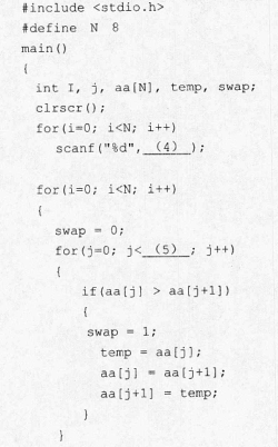 【程序3】是冒泡排序算法的实现。假设有N个数据存放在数组aa中,用冒泡排序将这N个数从小到大排序。首先,在aa[0]到aa[N..1]的范围内,依次比较两个相邻元素的值,若aa[j]>aa[j+1],则交换aa[j]与aa[j+1],j的值取0,1,2,…,N-2;经过这样一趟冒泡,就把这N个数中最大的数放到aa[N-1]中。接下来对aa[0]到aa[N-2]中的数再进行一趟冒泡,这样就将该范围内的最大值换到aa[N-2]中。依次进行下去,最多只要进行N-1趟冒泡,就可完成排序。如果在某趟冒泡过程中没有交换相邻的值,则说明排序已完成,可以提前结束处理。 【C程序代码1】