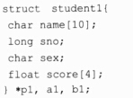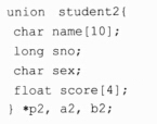 回答问题,将答案填写在答题纸中对应栏目。 (1)sizeof(struct student1)结果是多少? (2)sizeof(union student2)结果是多少? (3)变量a2在程序段2中定义,写出执行以下语句后的输出结果。