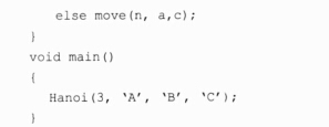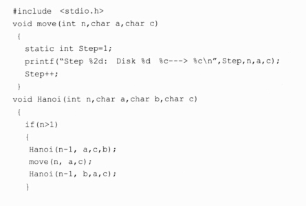 汉诺塔问题说明:有n个盘子在A处,盘子从小到大,最上面的盘子最小,程序要把这n个盘子从A处搬到C处,可以在B处暂存,但任何时候都不能出现大的盘子压在小的盘子上面的情况。 下列是一段求解汉诺塔问题的C语言程序。