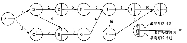PERT图中的有向弧表示任务,可以标上完成该任务所需的时间,图中的结点表示流入结点的任务已结束,并开始流出结点的任务,这里把结点称为事件。只有当流入该结点的所有任务都结束时,结点所表示的事件才出现,流出结点的任务才可以开始。事件本身不消耗时间和资源,它仅表示某个时间点。每个事件有一个事件号及出现该事件的最早时刻和最迟时刻。最早时刻表示在此时刻之前从该事件出发的任务不可能开始;最迟时刻表示从该事件出发的任务必须在此时刻之前开始,否则整个工程就不能如期完成。每个任务还可以有一个松弛时间(slack time),表示在不影响整个工期的前提下,完成该任务有多少机动时间。为了表示任务间的关系,图中还可以加入一些空任务(用虚线有向弧表示),完成空任务的时间为0。