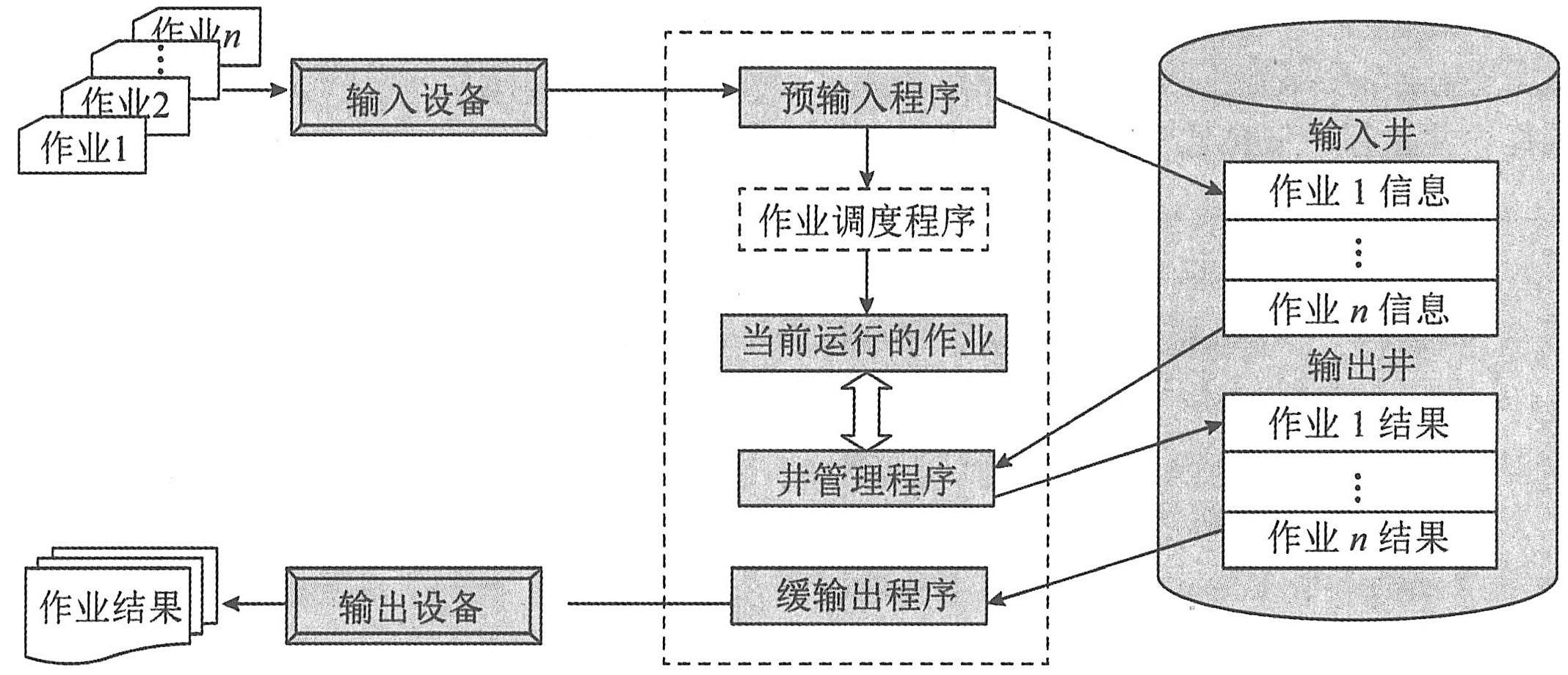 Spooling系统是由“预输入程序”“缓输出程序”和“井管理程序”以及输入和输出井组成的。其中,输入井和输出井是为了存放从输入设备输入的信息以及作业执行的结果,系统在辅助存储器上开辟的存储区域。Spooling系统的组成和结构如下图所示。