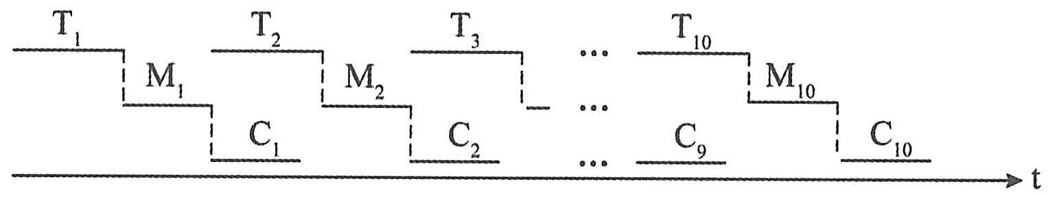 当第一块数据送入用户工作区后,缓冲区是空闲的可以传送第二块数据。这样第一块数据的处理C1与第二块数据的输入T2是可以并行的,以此类推,如下图所示。