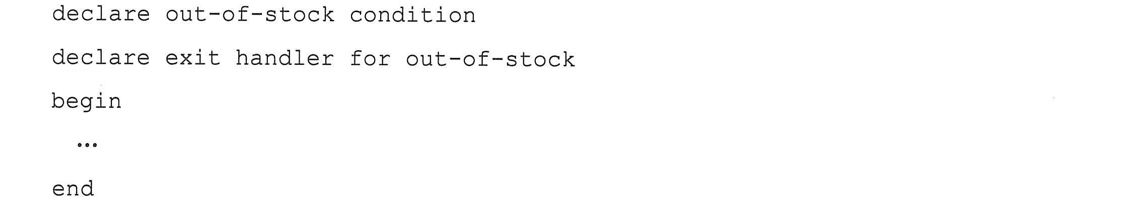 在begin和end之间的语句可以执行signal out-of-stock来引发一个异常。这个句柄说明,如果条件发生,将会采取动作终止begin end中的语句。替换的动作将是continue,它继续从引发异常的语句的下一条语句开始执行。除了明确定义的条件,还有一些预定义的条件,比如sqlexception、sqlwarning和not found。