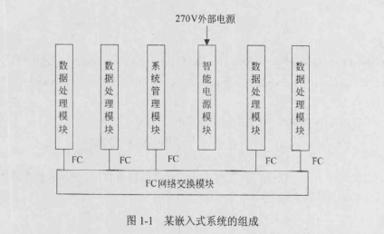 某公司承接了某嵌入式系统的研制任务。该嵌入式系统由数据处理模块、系统管理模块、FC网络交换模块和智能电源模块组成,系统组成如图1-1所示。数据处理模块处理系统的应用任务;系统管理模块除了处理系统的应用任务外,还负责管理整个嵌入式系统FC网络交换模块采用消息机制,支持广播和组播,主要负责系统的数据交换;智能电源模块负责给其他模块供电,该模块根据系统命令可以给其他模块供电或停止供电。