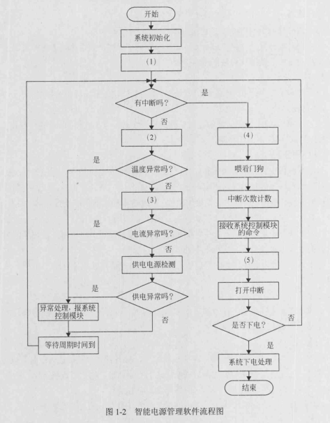 问题:1.4   智能电源模块首先进行系统初始化,初始化后各设备就可使用,再根据系统初始配置表对嵌入式系统的其他模块供电。智能电源模块通常完成两件事情:一、周期性地查询本模块温度、各路电流(给各模块供电的)以及电源模块的供电是否异常,如果异常,则进行异常处理,并报系统管理模块,由系统管理模块进行决策;二、进入中断处理程序,处理系统管理模块的各种命令,如果系统管理模块命令关机下电,则智能电源模块对所有模块(也包括自己)进行下电处理。