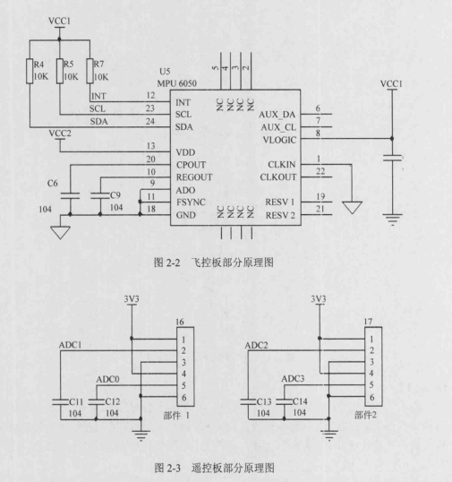 图2-1为李工设计的系统总体框图。飞控板和遥控板的核心处理器都采用STM32F103。飞控系统的惯性测量单元采用MPU6050测量传感器,MPU6050使用IIC接口,时钟引脚SCL、数据引脚SDA和数据中断引脚分别接到STM32的对应管脚,图2-2为该部分原理图。遥控板采用STM32单片机进行设计,使用AD对摇杆模拟数据进行采集,采用NRF2401无线模块进行通信,图2-3为该部分原理图。