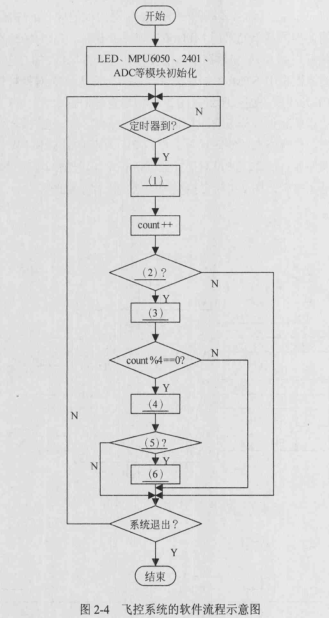图2-4为飞控系统软件实现的简要流程图,根据以上描述,请补全图2-4中的空(1)〜(6)处的内容。