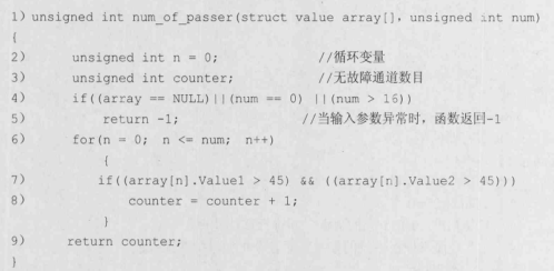 嵌入式系统中,存在16路数据采集通道,为了提高数据采集可靠性,对16路采集通道均采用双余度设计,为了监控采集通道是否发生故障,对各路双余度通道采集值进行比较,只有当该通道两个余度设备采集值均不小于45时,才表示该路通道正常。设计人员设计函数nUm_0f_paSSer用于统计无故障通道数目,在该函数的设计中考虑了如下因素: