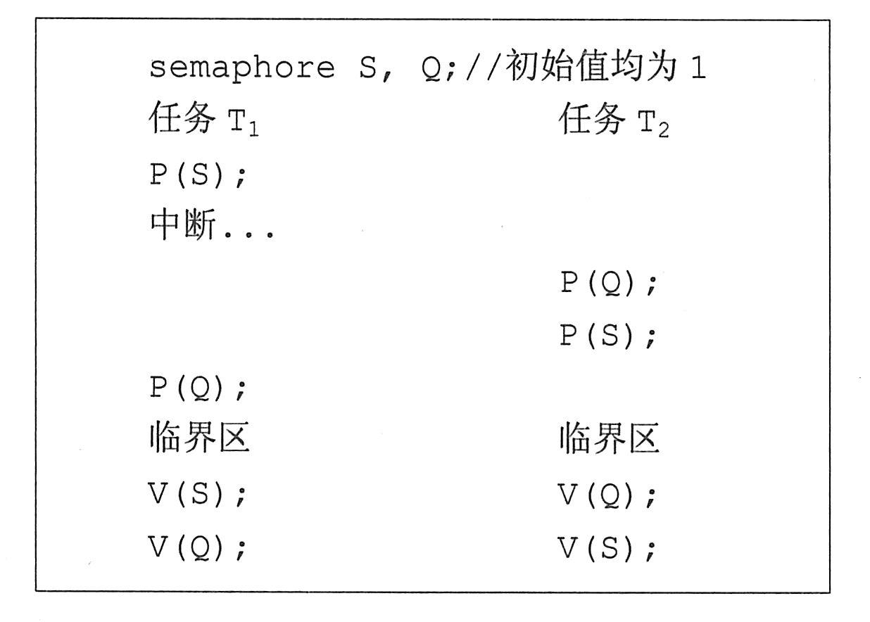 在系统中,定义了两个信号量S和Q,它们的初始值都是1。两个任务T1和T2,假设T1先被调度执行,它顺利地通过了P(S)操作,并使S的值变为0。假设这时发生了一次时钟中断,任务T2被调度执行。它顺利地通过了P(Q)操作,并将Q的值变为0。接着在执行P(S)操作时,由于S的值已经是0,因此T2在这里被阻塞起来,并让出CPU。然后任务T1重新开始运行,但是当它执行到P(Q)时,由于Q的值已经为0,因此T1也被阻塞起来。这样一来,任务T1和T2都处于阻塞状态,都在等待对方释放信号量,这就是一种死锁的状态。