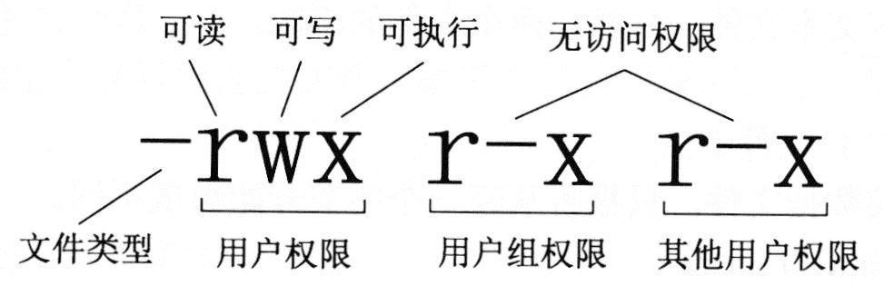 提示:访问权限规定了3种不同类型的用户,分别是文件属主(owner)、同组用户(group)和可以访问系统的其他用户(others)。每类用户有3种访问方式,即可读(r)、可写(w)、可执行或查找(x)。如下图所示的文件权限表示,该文件的属主有可读、可写和可执行权力,而同组用户和其他用户只有可读和可执行权力。文件权限也可以由3个八进制数来表示,例如,上述文件权限可表示为755。