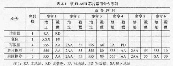 存储模块采用某公司的FLASH存储芯片。支持编程、擦除、复位等操作命令。该FLASH芯片的常用命令序列如表4-1所示。表中的地址和数据皆为16进制数。