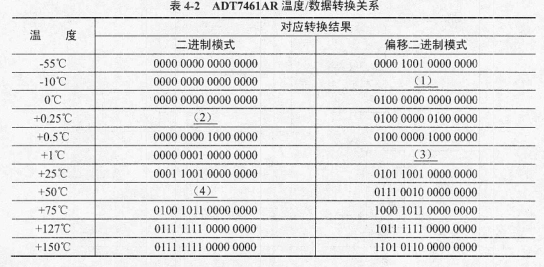 问题:4.1   ADT7461AR芯片支持两种测温模式,其中第0种模式为二进制模式,用0表示0度,测温范围为0℃〜+127℃;第二种模式为偏移二进制模式,用64表示0度,测温范围为-55℃〜+150℃,温度数据转换关系如表4-2所示。