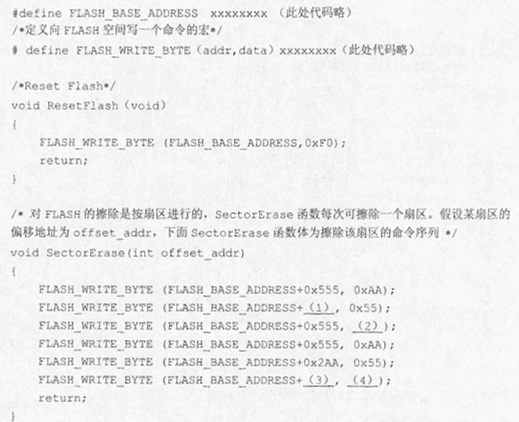 问题:4.2   沈工用C语言实现对FLASH的操作,需按照表4-1中定义的命令序列顺序执行即可。仔细阅读下列代码,请在(1)〜(4)处将对应的C语言代码补全。