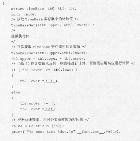 问题:4.3   该嵌入式系统对处理的性能要求较高,沈工在完成软件设计后,需要对每一个函数的执行性能进行测试,检测其是否满足系统设计的要求。沈工通过PowerPC处理器内部的高精度时钟寄存器(TimeBase)进行计时,该寄存器由高低两个32位的寄存器组成,根据总线频率自动递增,当低32位寄存器递增到0xFFFFFFFF时,向高32位寄存器进位。计数值可以换算成时间值,精确到微秒级。