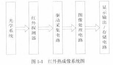 红外热成像系统如图1-1所示,主要由红外光学系统、红外探测器、驱动采集电路、图像处理电路、显示与存储电路组成。