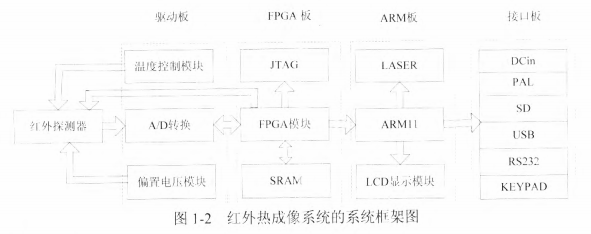 红外热成像系统具体的系统架构如图1-2所示,主处理器采用ARM,红外探测器采用非制长波红外探测器,系统电路包括偏置电压电路、温控电路、A/D转换电路、 基于FPGA的实时红外图像信号采集电路、基于ARM的系统控制电路以及LCD显示电路。实现了红外探测器的驱动、红外图像信号的采集和处理、红外图像的输出显示以及一些外设辅助功能。