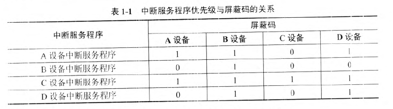 问题:1.3   (4分)假设该红外热像仪CPU的中断系统有4个中断源A、B、C、D,其硬件排队优先次序为A>B>C>D,每个中断源对应一个屏蔽码,表1-1为中断服务程序与屏蔽码的关系,其中 “0”为允许,“1”为屏蔽,CPU状态时屏蔽码为0000。