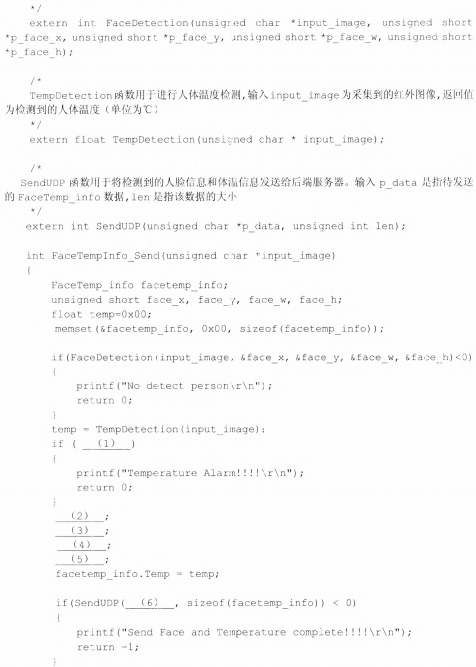 问题:5.3   (9分) 在红外热像仪的图像信息处理中,王工设计了如下人脸检测、温度检测及信息发送程序, 当检测到温度大于等于37.3°C时,需要报警提示。请补全程序中的(1)~(6)。