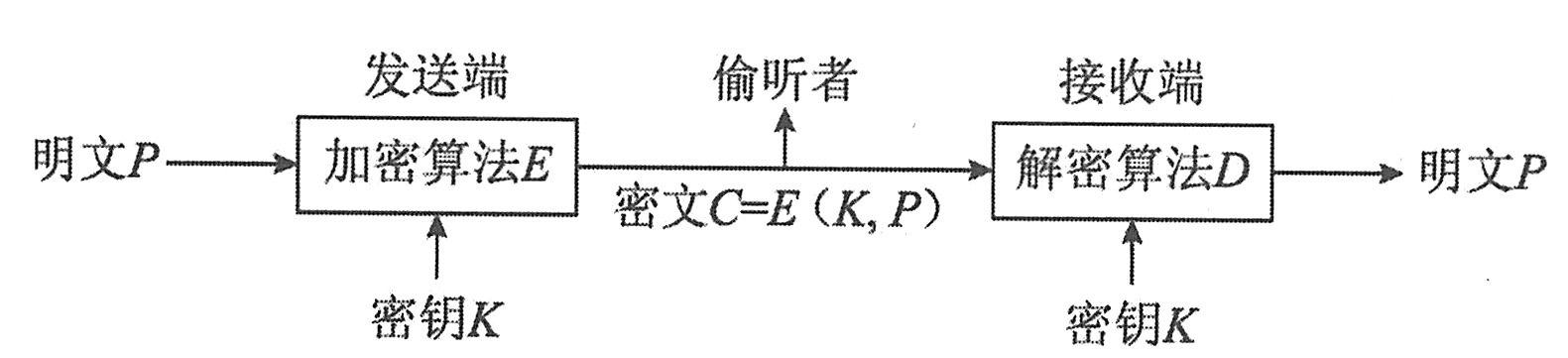 这里加/解密函数ED是公开的,而密钥K(加解密函数的参数)是秘密的。在传送过程中,偷听者得到的是无法理解的密文,而且他得不到密钥,这就达到了对第三者保密的目的。