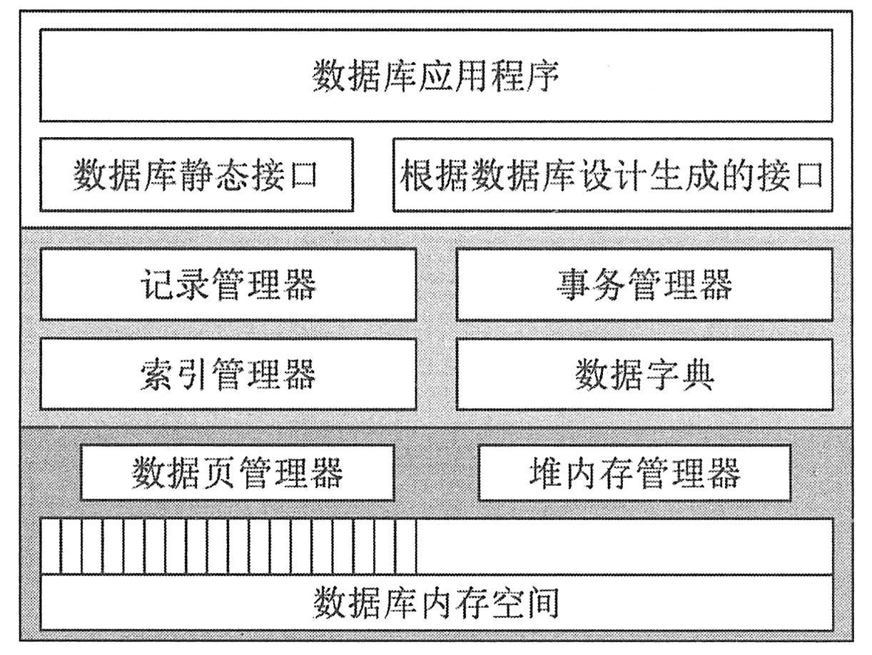 eXtremeDB体系结构的最上层代表数据库应用程序,其下一层是数据库静态接口和根据数据库设计生成的接口,分别代表eXtremeDB提供的外部应用接口(如数据库的创建和删除等)和通过数据库设计生成的外部接口(主要是数据操作接口),用户调用这些外部接口进行数据库操作;再下层则是数据库内核的相关模块,包括记录管理器、事务管理器、索引管理器、数据字典等;最下层是存储管理器,直接管理用户分配的内存空间。